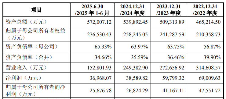 2022年至2024年及2025年上半年,宏明电子实现的营业收入分别为31.46亿元、27.27亿元、24.94亿元和15.28亿元,实现的归母净利润分别为4.76亿元、4.12亿元、2.68亿元和2.57亿元。