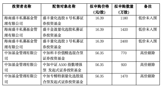 报价信息表显示,网下询价中,海南盛丰私募基金管理有限公司管理的3只产品报出16.39元/股最低价,均因报价过低被剔除;中加基金管理有限公司管理的3只产品报出56.35元/股最高价,均因报价过高被剔除。
