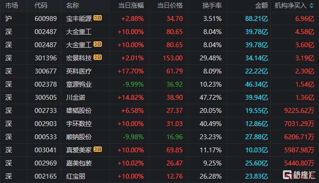 龙虎榜中涉及机构专用席位的个股中,当日净买入额前三为大金重工、英科医疗、章源钨业,分别为4.58亿元、2.30亿元、1.54亿元。