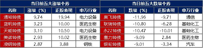 【转债市场主要指数集体跟跌】 3月13日,转债市场跟随权益市场延续走弱,中证转债、上证转债、深证转债分别收跌1.04%、1.10%、0.94%。转债市场成交额735.53亿元,较前一交易日放量101.20亿元。转债市场个券多数下跌,368支转债中,42支收涨,312支下跌,14支持平。当日上涨个券中,通裕转债涨超9%,蓝帆转债、天能转债涨超3%;下跌个券中,奥飞转债跌逾11%,联瑞转债、永22转债跌逾10%。