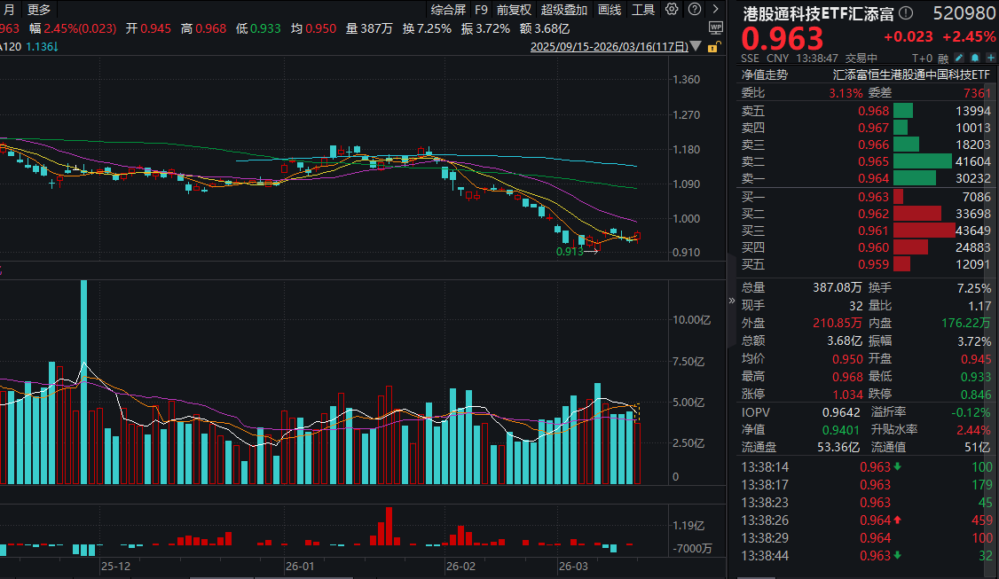 今日午后,港股通科技ETF汇添富(520980)、恒生科技ETF汇添富(513260)双双大涨超2%!港股通科技ETF汇添富(520980)标的指数聚焦TMT行业,不含医药、家电、汽车,AI属性更纯,午后大涨近3%,成交额超4.2亿元!恒生科技ETF汇添富(513260)标的指数囊括了京东集团-SW、百度集团-SW、网易-S、携程集团-S等后缀带S的二次上市港股互联网科技龙头,覆盖度更全,更能全面表征中国顶级科技资产。