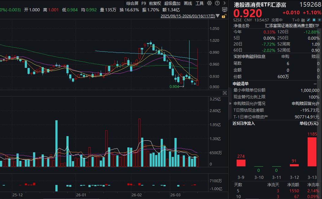 聚焦纯正新消费的港股通消费ETF汇添富(159268)涨超1%,盘中再获600万份净申购!