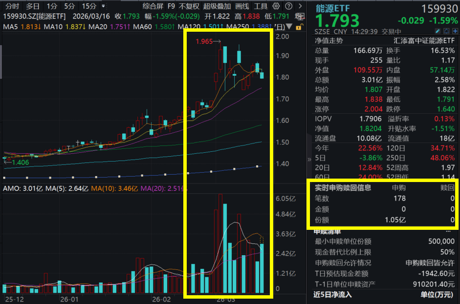 3月16日,A股市场整体震荡回调,油气板块震荡上行,截至14:30,油气纯度更高的油气ETF汇添富(159309)涨0.75%。“仅含24只煤油股”的能源ETF(159930)跌超1.5%,资金逢跌逆势增仓,能源ETF(159930)强势吸金近2亿元!