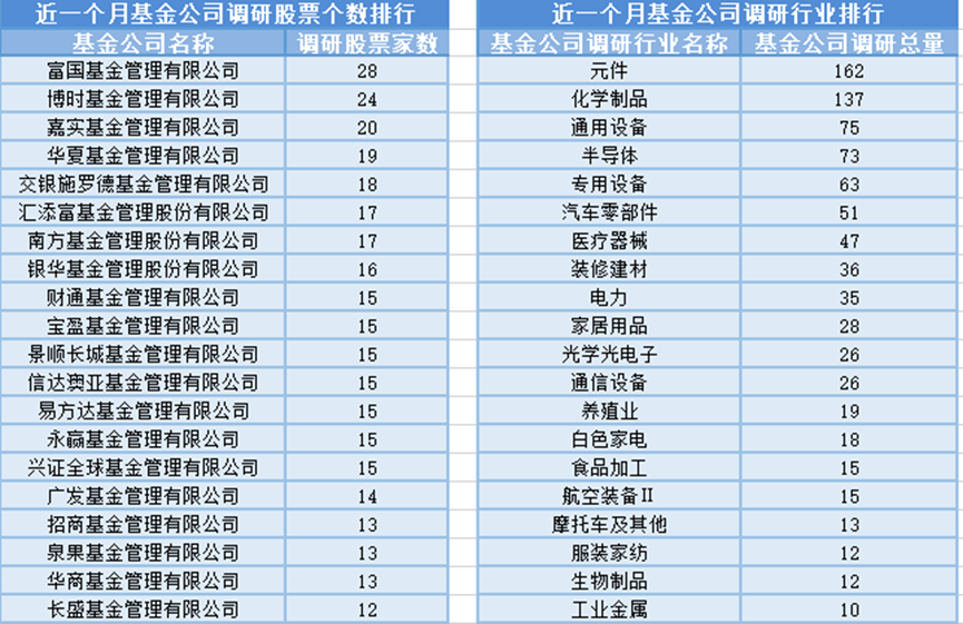 近一个月(2月14日-3月16日),富国基金参与公司调研的数量最多,共调研28家上市公司,此外调研较为活跃的还有博时基金、嘉实基金和华夏基金,分别调研24家、20家、19家上市公司;从调研行业上来看,基金公司对元件行业的上市公司调研次数最多,共有162次,其次是化学制品行业,基金公司调研了137次。