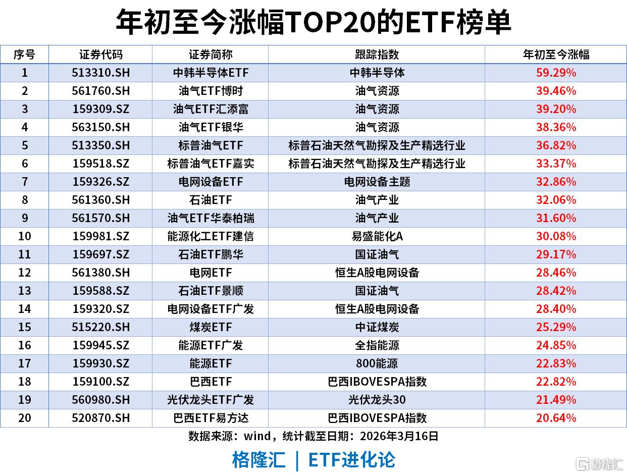 年初至今涨幅TOP20ETF(截至2026-03-16)