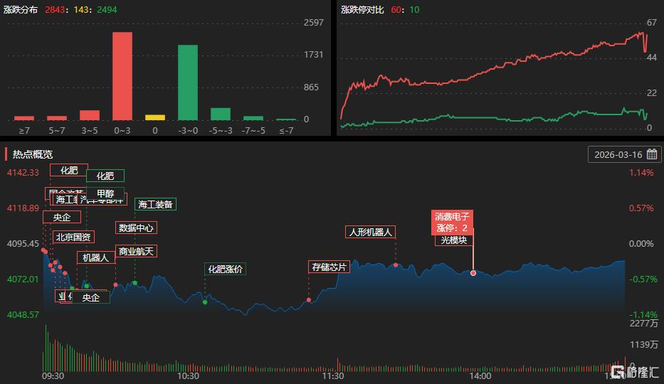3月16日,沪指跌0.26%报4084点,全市场成交额2.34万亿元,超2800股上涨。市场热点聚焦农业、粮食、存储芯片板块。