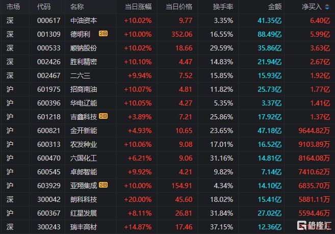 龙虎榜单日净买入额前三为中油资本、顺钠股份、胜利精密,分别为6.4亿3.63亿2.67亿元。
