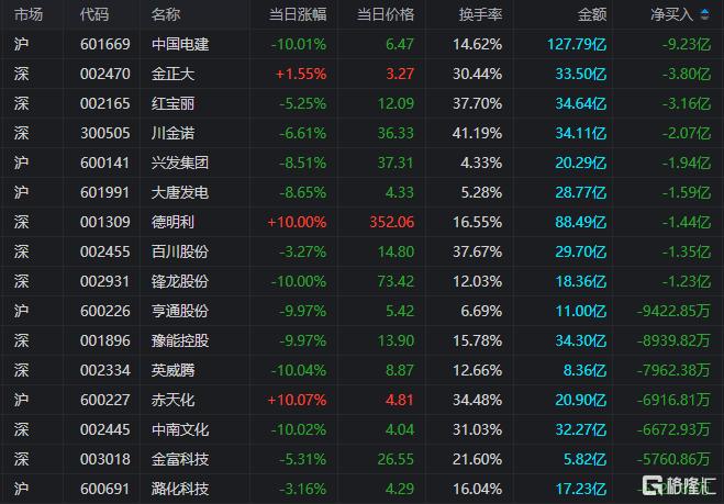 龙虎榜单日净卖出额前三为中国电建、金正大、红宝丽,分别为9.23亿元、3.8亿元、3.16亿元。
