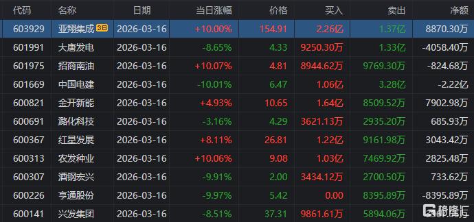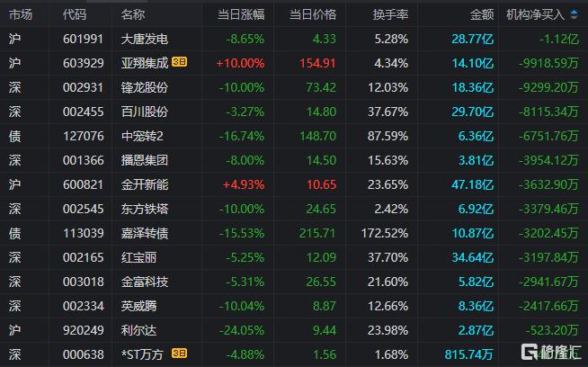 龙虎榜中涉及机构专用席位的个股中,当日净卖出额前三为大唐发电、锋龙股份、百川股份,分别为1.12亿元、9299.2万元、8115.34万元