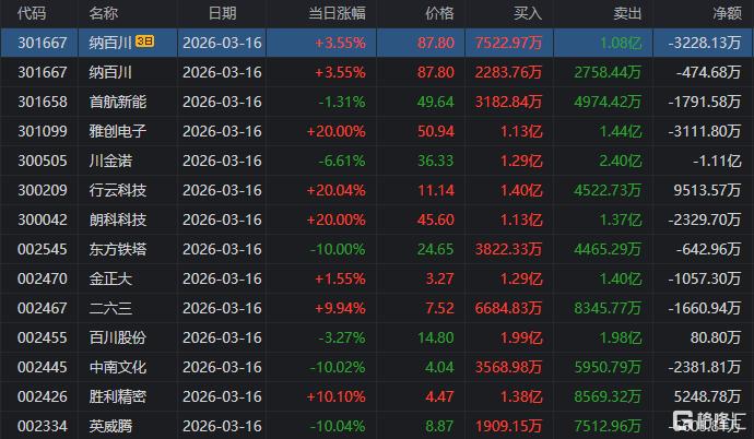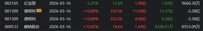 龙虎榜中涉及机构专用席位的个股中,当日净买入额前三为德明利、顺钠股份、招商南油,分别为1.98亿元、9733.91万元、8685.53万元。