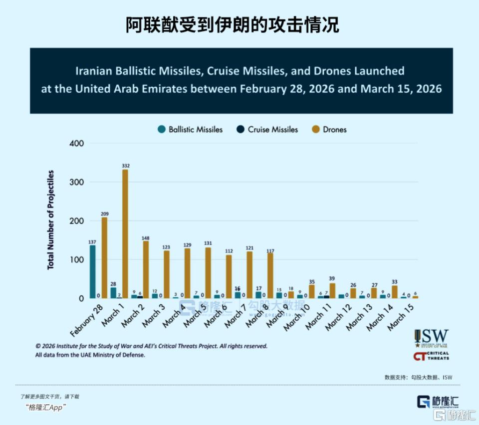 而在特朗普耗尽他的权限资源前,伊朗也不可能被他打趴下。伊朗的火力确实相比此前衰减了很多(下图是阿联猷受到伊朗攻击的情况,它是被伊朗攻击最严重的海湾国家),但它依然是有能力控制霍尔木兹海峡的。