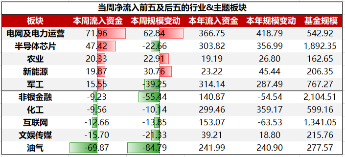 行业&主题板块ETF中,净流入前五大板块依次为:电网及电力运营、半导体芯片、农业、新能源、军工;净流出前五大板块依次为:油气、文娱传媒、互联网、化工、非银金融。