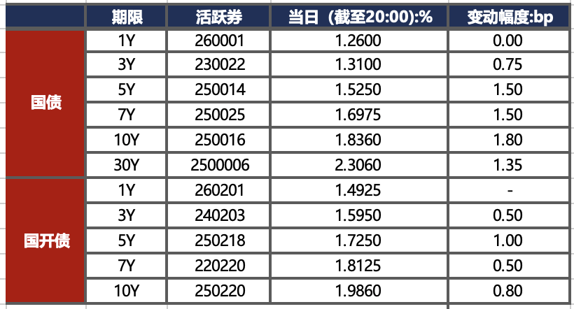 3月16日,国际油价维持高位,带动国内通胀预期持续发酵,债市承压走弱。截至北京时间20:00,10年期国债活跃券250016收益率上行1.80bp至1.8360%,10年期国开债活跃券250220收益率上行0.80bp至1.9860%。