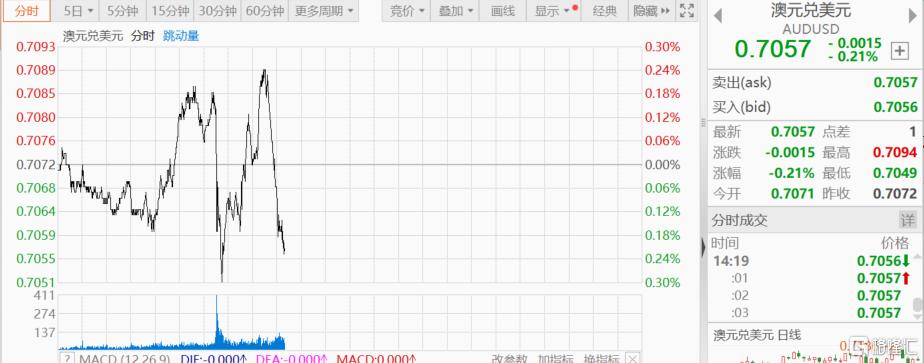 消息公布后,澳元兑美元汇率出现剧烈波动,目前在0.7左右浮动。
