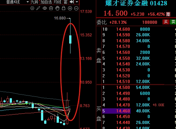 若从3月13日算起,耀才证券两个交易日内最大涨幅超过144%,截至发稿耀才证券报14.34港元/股,股价轻松翻倍。