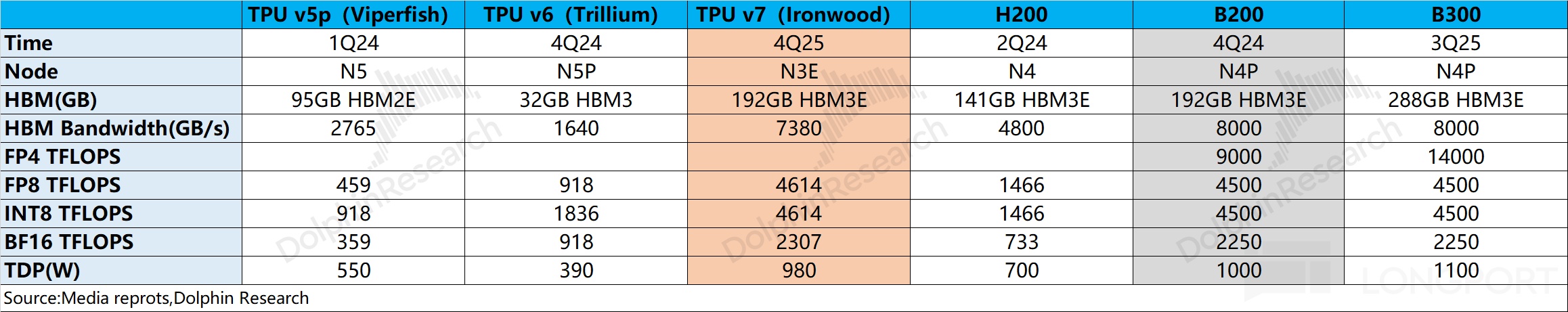 3)产品竞争力:当前谷歌TPUv7 在 FP8 等领域的表现大致已经接近于英伟达的 B200(2024 年四季度量产),谷歌 TPU 大致落后于英伟达一年左右。