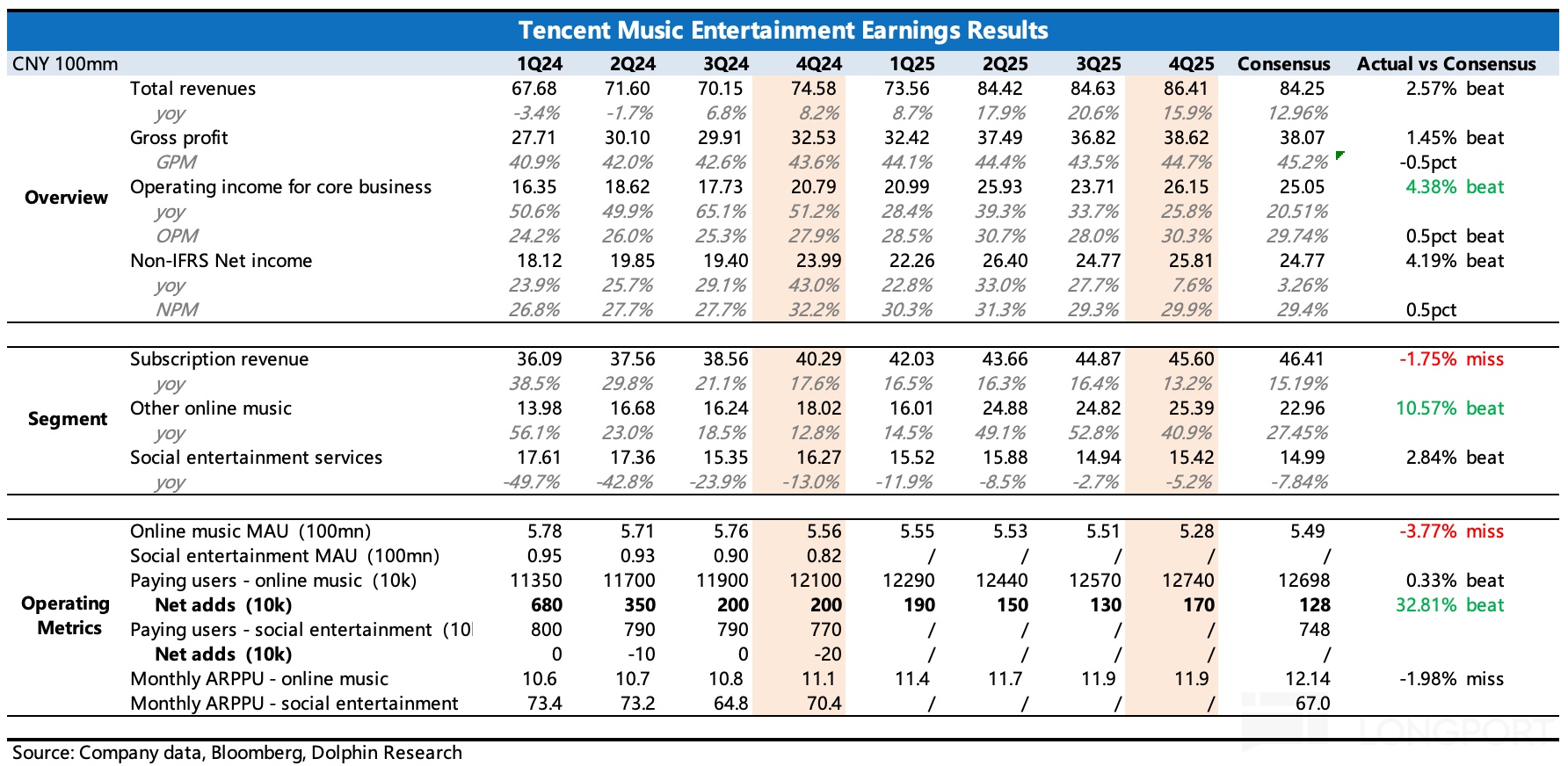 北京时间 3 月 17 日港股盘后、美股盘前,$腾讯音乐(TME.US) 发布了 2025 年第四季度财报。Q4 业绩好坏参半,第二曲线继续发力,但用户生态不稳,致使订阅收入增长降速,因此海豚君总体观感不佳。
