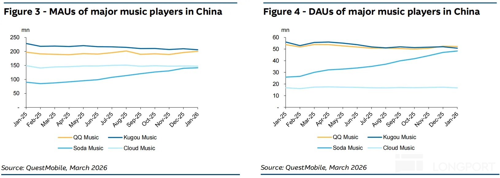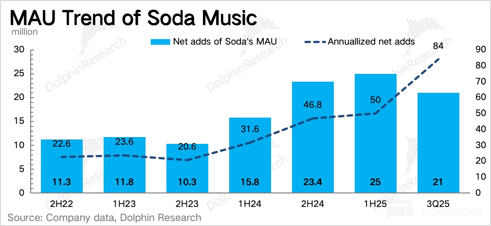 截至 26 年初,汽水音乐整体用户规模 MAU 已经达到 1.4 亿,进一步缩小与云音乐的差距。但粘性更高(日常抖音流量贡献 80% )的汽水音乐,近 5000 万的 DAU 早就超过了云音乐,目前已经非常接近独立的 QQ 音乐或酷狗音乐。假设按照 QQ 音乐的用户粘性 DAU/MAU 来换算腾讯音乐整体的 DAU 规模,也就是 28% 的用户粘性对应 28%*5.6 亿,近 1.6 亿的日活,是汽水音乐的 3 倍。