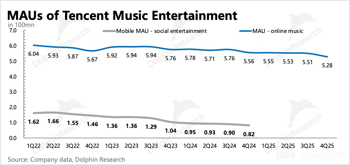 四季度 MAU 继续流失 2300 万用户,来到 5.28 亿,虽说四季度一般都有季节性流失,但用户数持续走低下这次也未见流失放缓。音乐付费用户净增 170 万,环比略有增加,季末达到 1.27 亿,付费率提升至 24%。