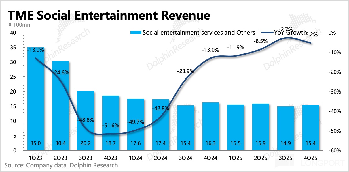 4. 社交娱乐底部徘徊:四季度直播、K 歌等收入下降 5%,仍处于底部但基本已经稳定。