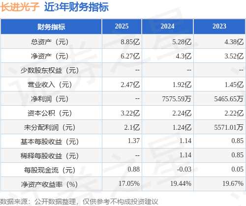 从目前公布的财报来看,长进光子2025年总资产为8.85亿元,净资产为6.27亿元;近3年净利润分别为nan元(2025年),7575.59万元(2024年),5465.65万元(2023年)。详情见下表: