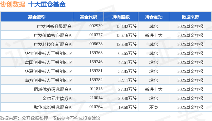 持有协创数据最多的基金为广发创新升级混合,目前规模为39.21亿元,最新净值2.5528(3月17日),较上一交易日下跌3.62%,近一年上涨30.5%。该基金现任基金经理为刘格菘 吴远怡。