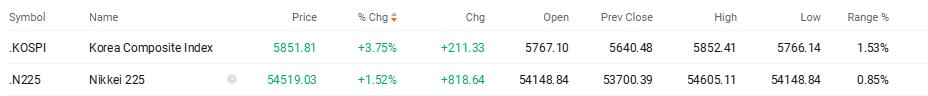 随后涨幅持续扩大,截至发稿,日经225指数日内涨幅达1.52%;韩国首尔综指涨幅进一步扩大至3.75%。