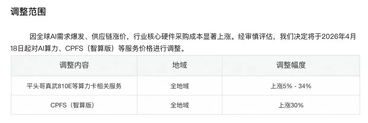 3月18日午间,阿里云突然官网发了一则提价公告。阿里云表示,因全球AI需求爆发、供应链涨价,阿里云AI算力、存储等产品最高涨价34%。其中,平头哥真武810E等算力卡产品上涨5%-34%,文件存储产品CPFS(智算版)上涨30%。阿里云表示,如果用户在2026年4月18日之前已购买了相关的服务,在当前的订单/计费周期内将不受此次调整影响,新价格将在用户下一个续费周期开始时适用。
