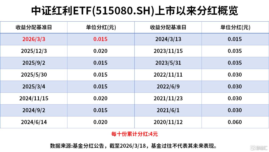 3月17日,两市经典“红利标杆”中证红利ETF(515080.SH)实施2026年首次分红权益登记,今日分红除息,下周一(3月23日)分红款到账,每10份派0.15元,也是其上市以来的第16次分红,累计每10份分红达4元。