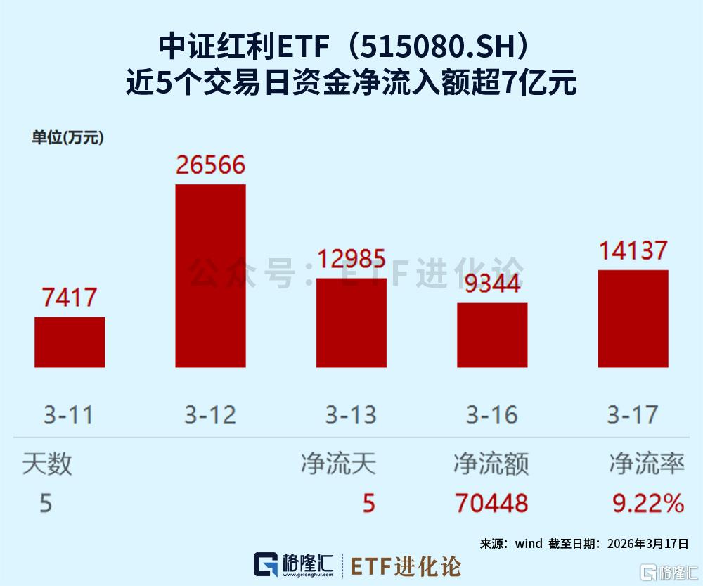 3月以来市场波动放大,但资金对红利类ETF的增持反而加速。其中,中证红利ETF(515080.SH)已连续6日获得资金净流入,净流入额7.35亿元,近一周份额增长8%,最新规模83.91亿元。