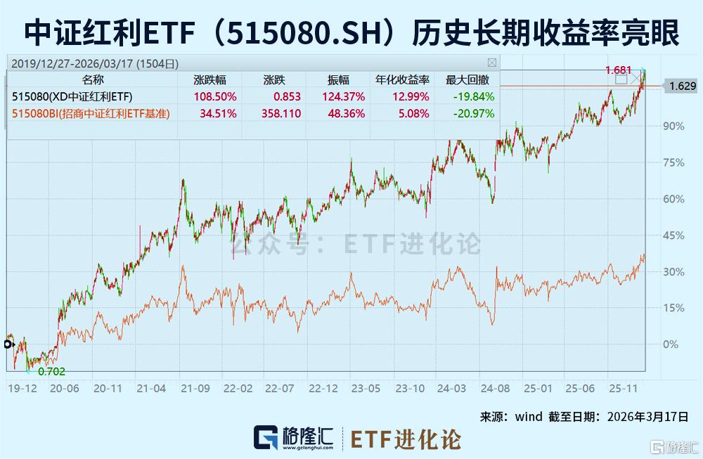历史数据对比,截至2026年3月17日,中证红利ETF(515080.SH)成立以来累计回报达108.5%,相对业绩比较基准实现超额收益73.99%;