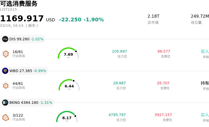 麦当劳 (MCD) 收盘下跌3.35%, 所属行业可选消费服务下跌1.90% ,公司涨幅跑输行业涨幅,行业成交额前三股票 迪士尼 (DIS) 下跌 1.02%;华纳兄弟探索公司 (WBD) 下跌 0.99%;缤客 (BKNG) 下跌 1.31%。