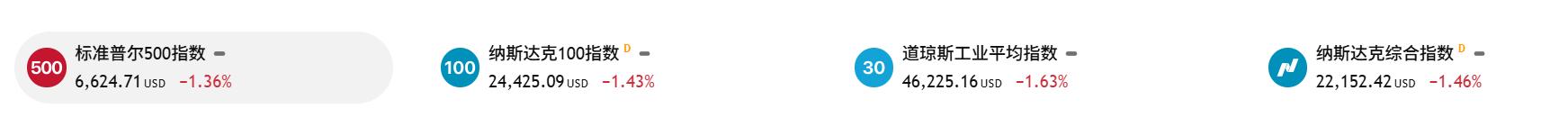 道指跌1.63%,标普500指数跌1.36%,均收于去年11月以来新低;纳指跌1.46%。