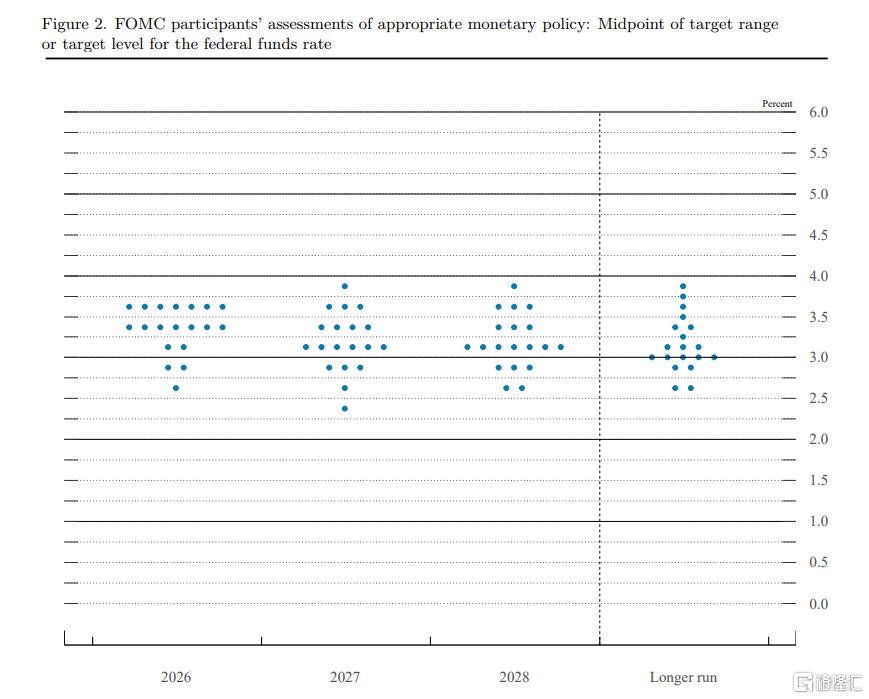 点阵图显示,美联储官员维持2026年降息一次、2027年降息一次的预测。