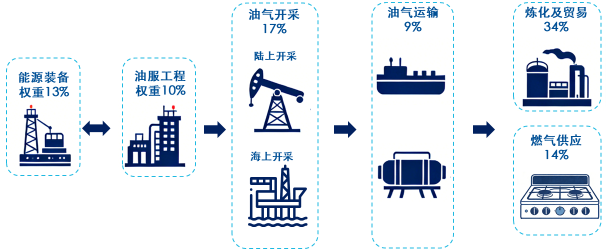 图:油气产业结构图与国证石油天然气指数在各细分产业权重分布