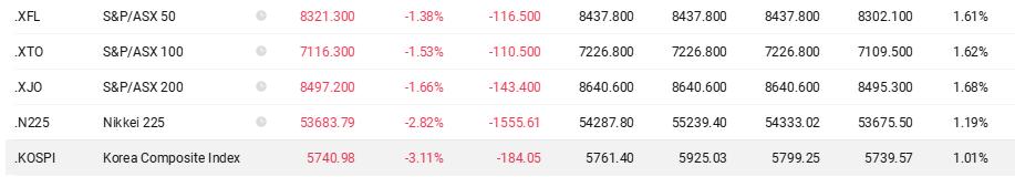 周四开盘后,亚太主要股指集体走弱,MSCI亚太指数开盘下挫1.1%。韩国首尔综合指数低开2.8%,领跌亚太市场;澳大利亚S&P/ASX 200指数开盘下跌1.6%;日本日经225指数早盘低开1.7%,随后跌幅进一步扩大至2.82%。