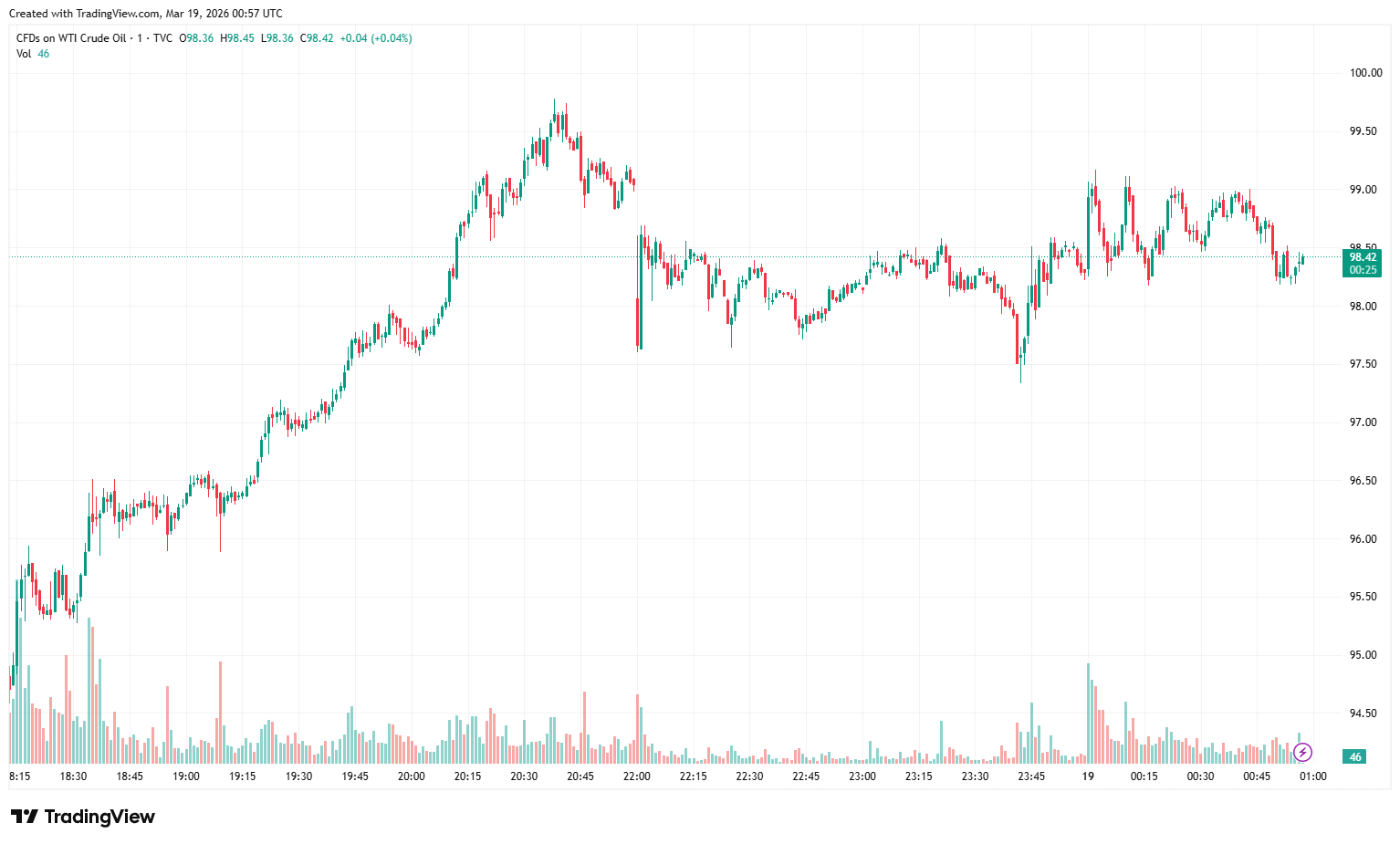 19日亚太时段,WTI原油期货价格在每桶98美元徘徊,距离100美元大关仅一步之遥。