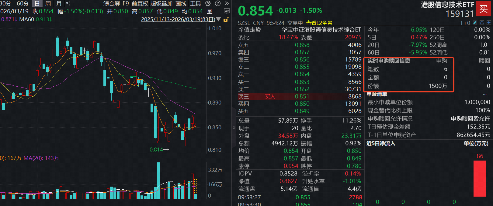 今日(3月19日),A股港股同步下挫,港股硬科技在昨日大涨后猛回调,全市场唯一*港股信息技术ETF(159131)低开后维持震荡,场内价格现跌1.5%。值得注意的是,盘中出现实时净申购1500万份,资金逢跌抢筹意愿明显。