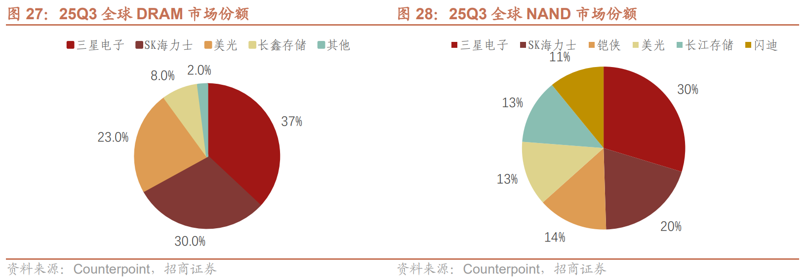 目前国外主要由三星、SK海力士、美光三大存储原厂占据全球主要份额,国内DRAM第一供应商长鑫存储2025年三季度占全球份额的8%,另一家国产NAND龙头长江存储2025年三季度占全球销量份额的13%,目标2026年占全球份额的15%,扩产后供应量预计占全球20%。