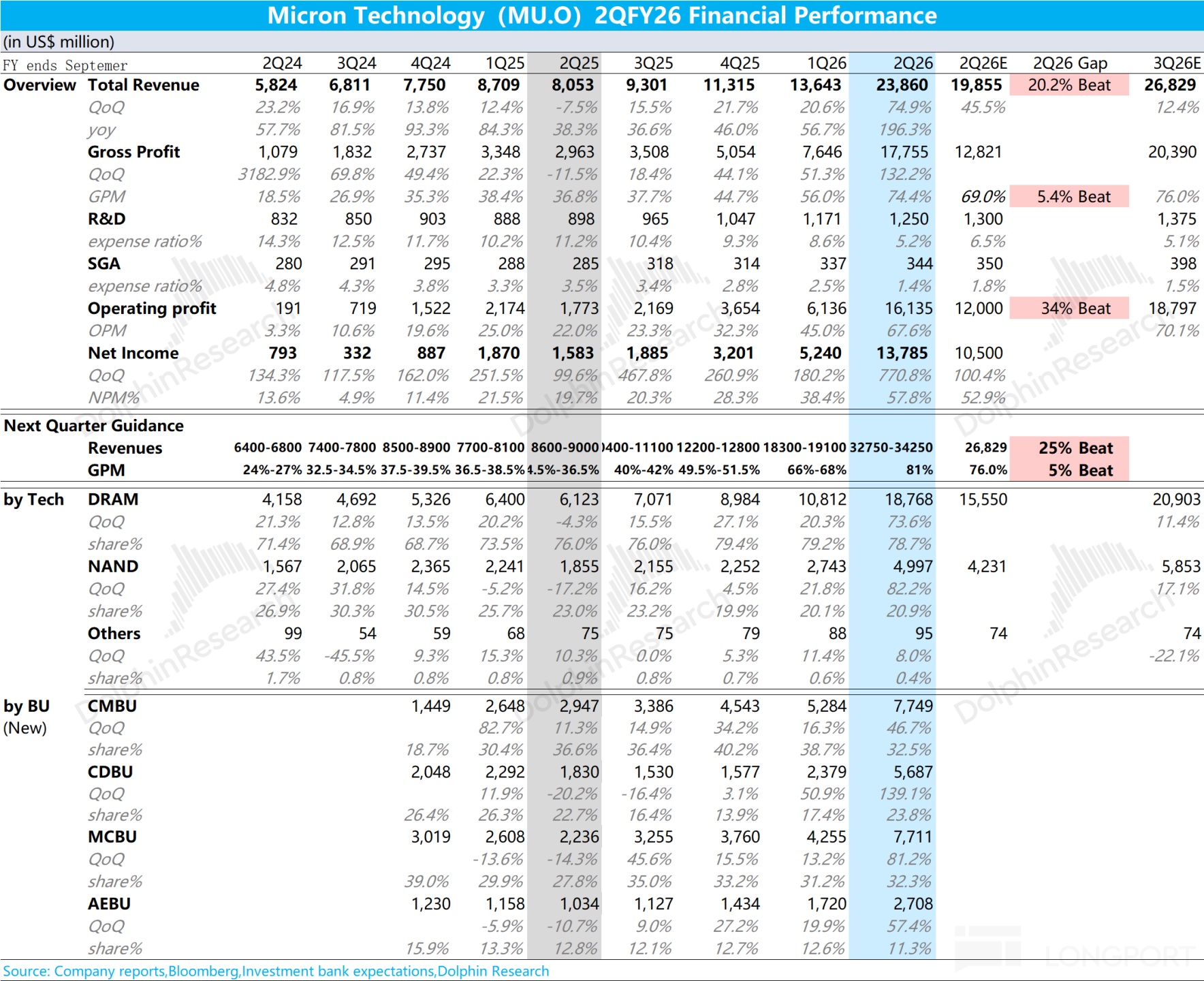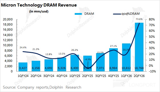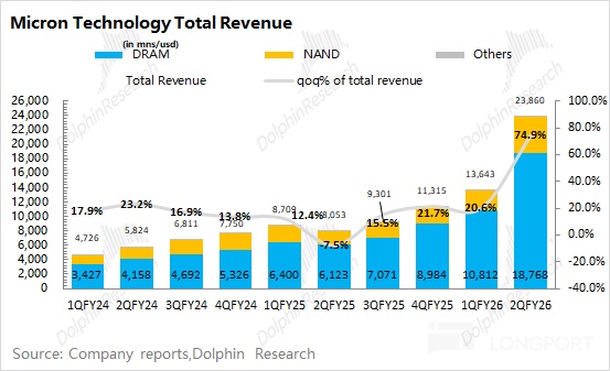 美光公司 2026 财年第二季度总营收为 238.6 亿美元,环比增长 75%,好于市场预期(199 亿美元)。本季度的收入环增,来自于 DRAM 和 NAND 的双双推动