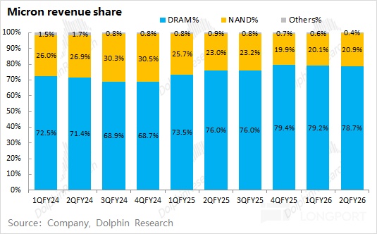 从最新的财报看, DRAM 和 NAND 仍然是公司最重要的收入来源,其中 DRAM 的收入占比维持在 8 成左右。