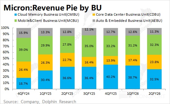此外,美光公司在之前调整了披露口径(面向于下游各市场的收入情况),将原来的 CNBU、SBU、MBU 和 EBU 重新划分为CMBU、CDBU、MCBU 和 AEBU 四类。当前数据中心及云业务的占比已经达到 50% 以上,业务口径调整也凸显了公司对相关业务的重视