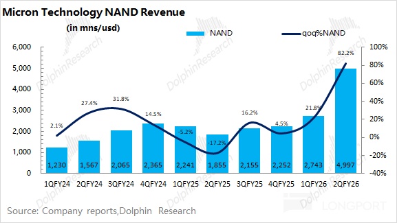 NAND 是公司第二大收入来源,占比约为 20%。本季度公司 NAND 业务收入为 50 亿美元,环比增长 82%。其中本季度 NAND 出货量环比微增 2%,但产品均价环比大幅增长 78% 左右。