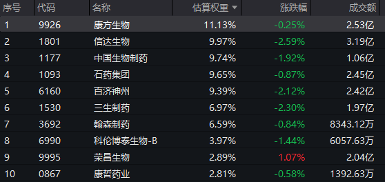 港股通创新药ETF(159570)标的指数权重股多数飘绿:信达生物、百济神州、三生制药跌超2%,中国生物制药、科伦博泰生物-B跌超1%,康方生物、石药集团、翰森制药微跌。