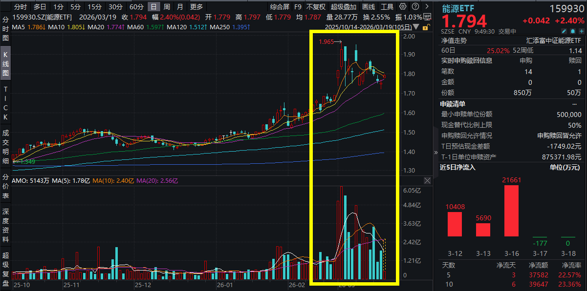 3月19日,A股市场震荡回调,地缘冲突背景下,能源安全重要性凸显,煤、油板块冲高!截至10:00,仅含24只煤油股的能源ETF(159930)逆市大涨超2%,且盘中再获资金净流入超1600万元!