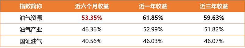 (3)指数更具弹性、表现更优:得益于中证油气资源指数纯正的编制方案,该指数最近六个月、一年、三年的累计收益在同类指数中领先。
