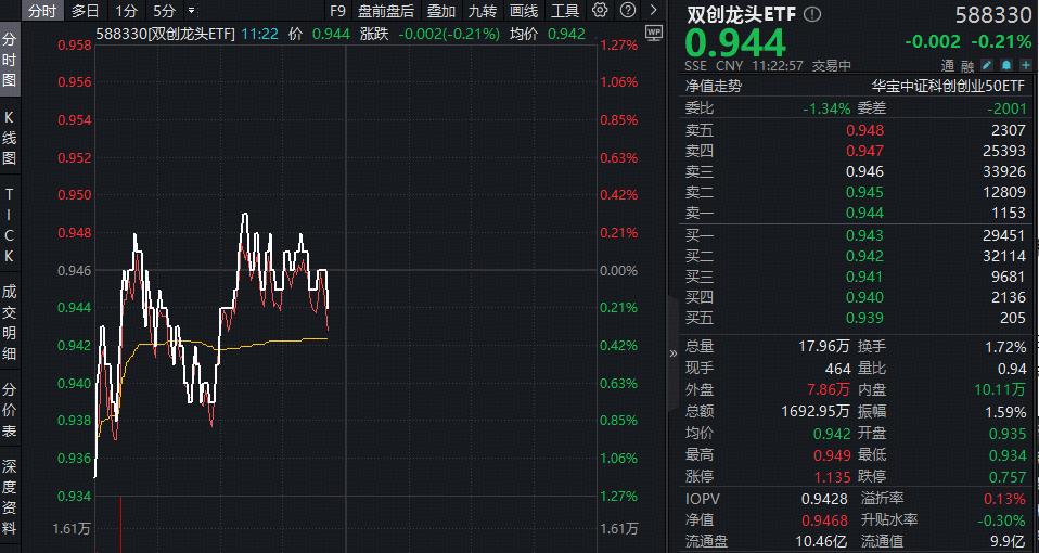 今日(3月19日)A股主要指数悉数飘绿,百分百布局新质生产力的——双创龙头ETF(588330)场内涨幅盘中逆市摸高0.32%,现跌0.21%,整体表现优于市场主要宽基指数,彰显韧性,值得关注的是,该ETF场内频现溢价区间,或有资金看好硬科技赛道后市表现,积极进场布局!