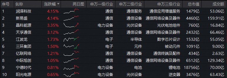 细分方向来看,光模块龙头涨幅居前,新易盛涨超4%,天孚通信涨逾3%,中际旭创涨超1%;此外,光伏龙头晶科能源涨超3%,存储芯片龙头江波龙涨逾1%;锂电池龙头宁德时代逆市飘红。