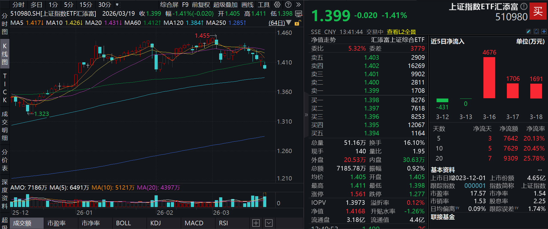 截至2026年3月19日 13:41,上证综合指数(000001)下跌1.38%。成分股方面涨跌互现,华特气体领涨14.38%,奥福科技上涨13.62%,长光华芯上涨11.57%;深科达领跌14.66%,恒烁股份下跌11.98%,隆达股份下跌11.09%。上证指数ETF汇添富(510980)下跌1.41%,最新报价1.4元。拉长时间看,截至2026年3月18日,上证指数ETF汇添富近3月累计上涨5.58%,涨幅排名可比基金2/6。(以上所列股票仅为指数成份股,无特定推荐之意)