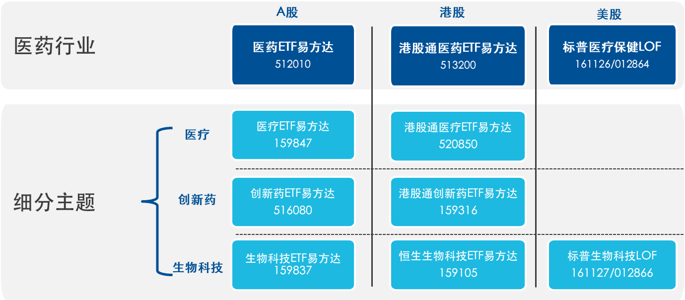 目前,易方达指数产品线具备完善的医药产品矩阵,既包含能够表征A股、港股、美股市场医药资产整体表现的指数产品,也包含创新药、生物科技、医疗等核心赛道,为投资者配置医药行业提供体系化产品矩阵和综合解决方案。